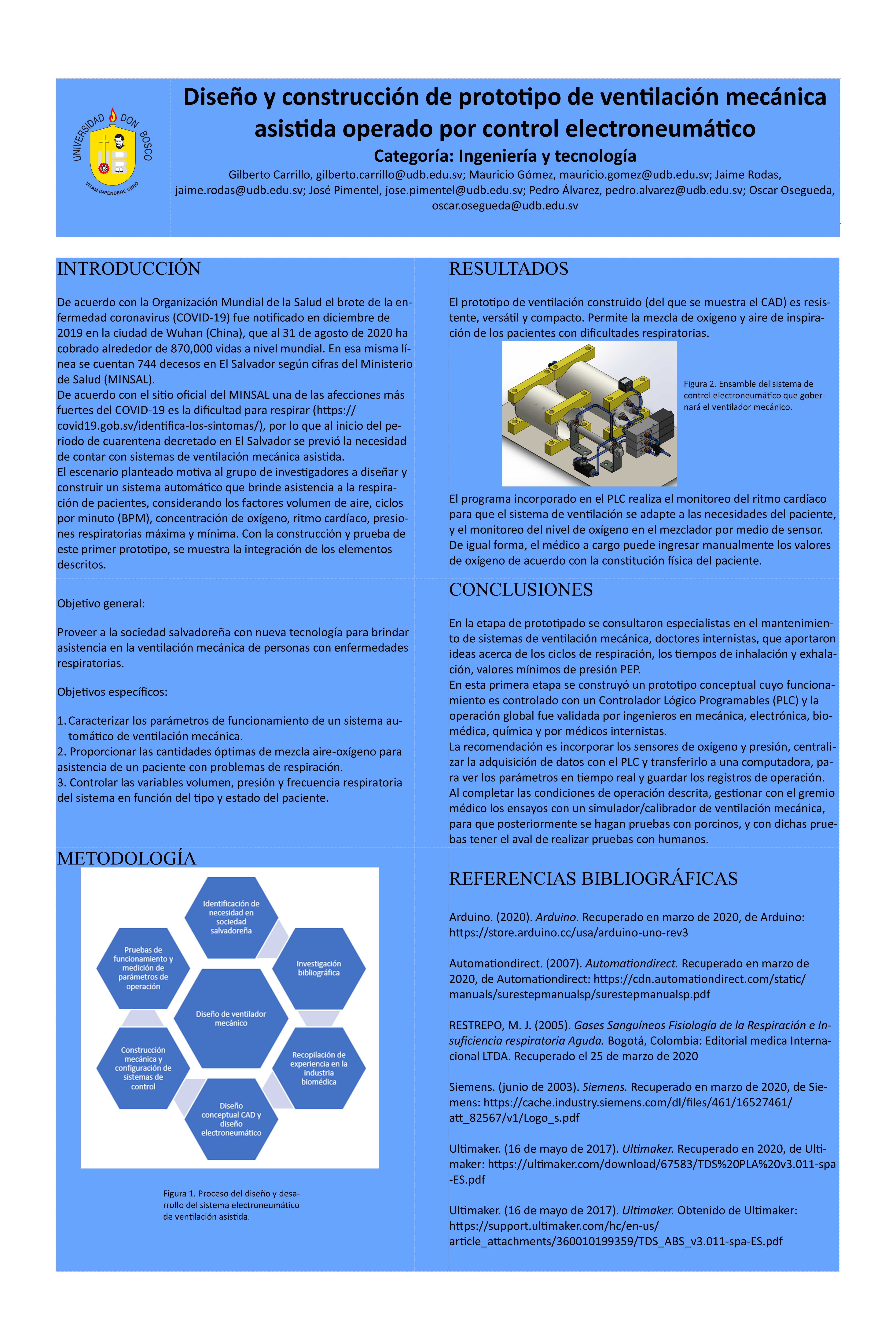 Carrillo, G., Gómez, M., Rodas, J., Pimentel, J., Álvarez, P., & Osegueda, O. (2020). Diseño y construcción de prototipo de ventilación mecánica asistida operado por control electroneumático [Póster académico]. Universidad Don Bosco.